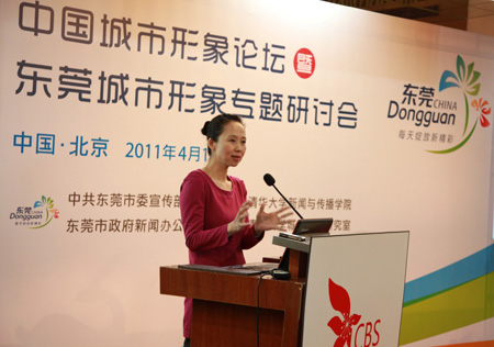 2011年04月13日由东莞市委宣传部、市政府新闻办与清华大学新闻与传播学院、清华大学城市品牌研究室共同举办的“中国城市形象论坛暨东莞城市形象专题研讨会”在清华大学紫光国际交流中心举行。发布会上,由东莞市委宣传部副部长李翠青与清华大学城市品牌研究室主任范红教授共同发布了东莞城市的宣传口号——“每天绽放新精彩”,并同时发布了由清华大学城市品牌研究室设计的东莞市城市形象标识——“活力绽放的莞香花”。