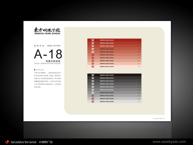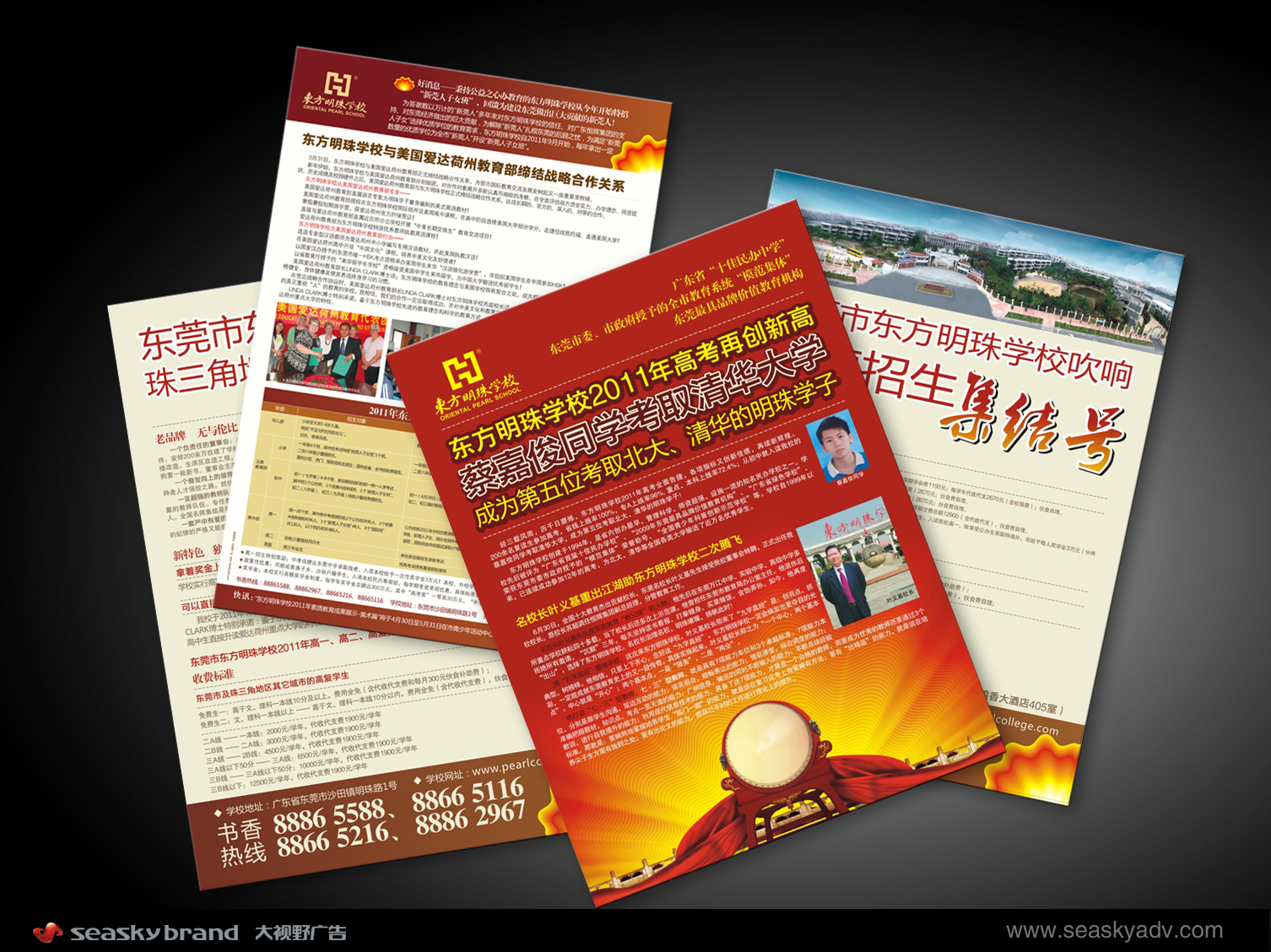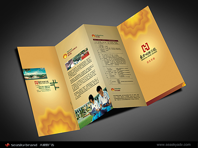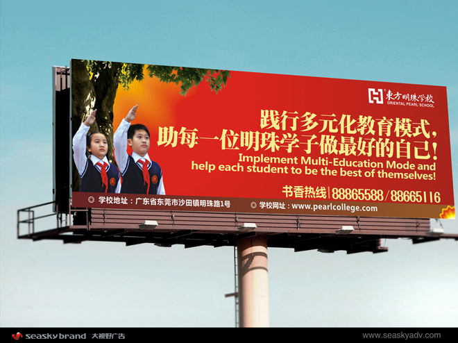 大视野广告公司为东方明珠学校进行了全面的品牌诊断,为东方明珠学校度身定制了全新的品牌战略,将实现东方明珠品牌形象由内而外的突破性提高,从VIS设计、宣传画册设计、视觉形象导视设计、户外广告投放、报纸媒体广告发布、电视广告投放、活动策划等方面,使东方明珠学校品牌形象得以全面升级,助其品牌竞争力一跃成为同业前列,成为东莞最具国际化的现代民办学校。