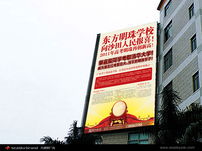 通过大视野广告公司与恒晖集团以及东方明珠全体教职工的努力,东方明珠学校在2011年上半年取得了不俗的成绩,校园环境得到了良好的改造逐渐形成了良好的品牌形象,同时也树立了良好的意识。东莞日报、南方都市报、东莞时报、虎门报、沙田报、阳光网等众多媒体对东方明珠学校品牌的重生和取得的成绩纷纷作了相关报道。尤其是2011年高考东明明珠再创佳绩,蔡嘉俊同学考取了清华大学,成为东方明珠学校考取清华、北大第五人。同时2011年暑假招生情况相当乐观,各个年级的招生都比预期要好,有的要比预期高出20%以上。东方明珠突出重围,破茧而出,正绽放在东莞这块热土上,相信东方明珠学校在恒晖集团、东方明珠全体教职工以及大视野广告的共同努力下将绽放更多的精彩。