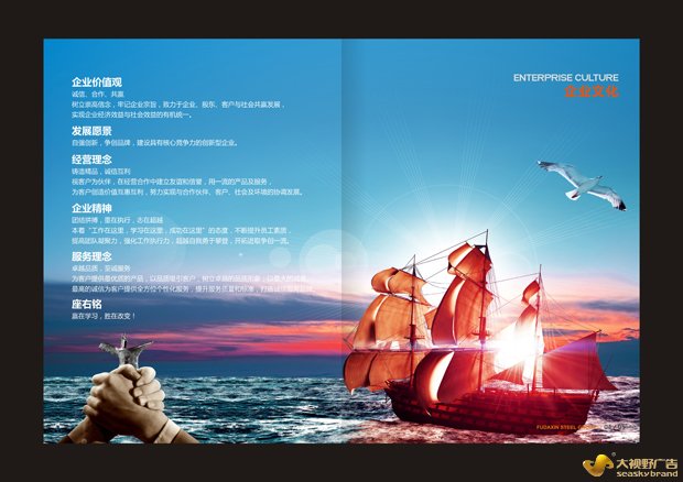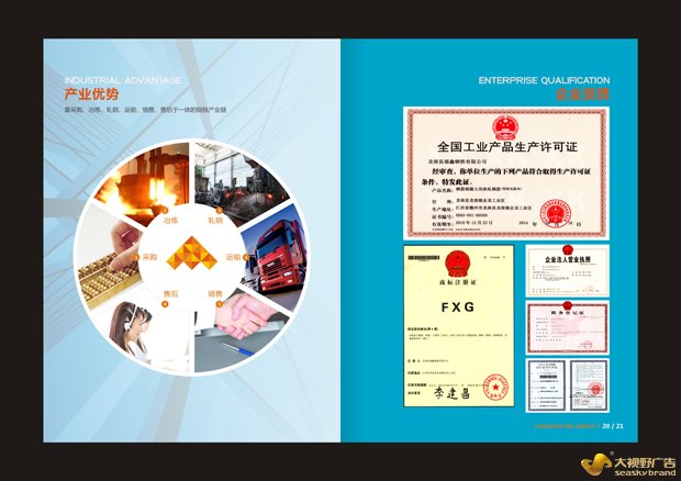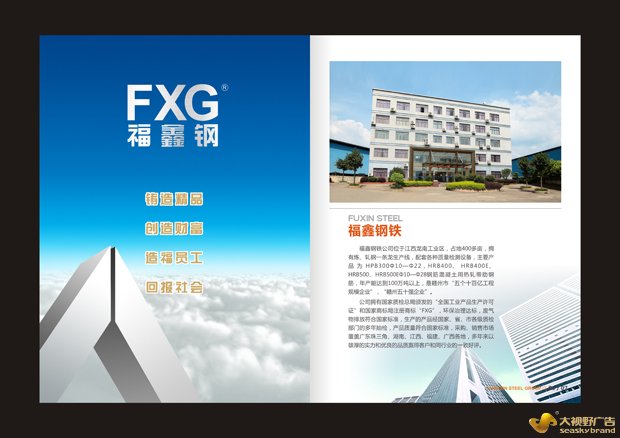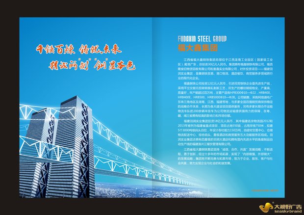 大视野根据福大鑫钢铁集团整体形象,结合市场分析,为福大鑫钢铁集团设计了一款大气、经典形象的企业画册,提高品牌的识别度。全新的画册体现福大鑫钢铁集团“铸造精品,诚信互利”的经营理念,把福大鑫钢铁集团良好的一面展现出来,提升了福大鑫的知名度,市场地位进一步提升。