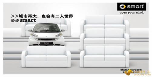 奔驰Smart的定位营销是做得非常好,一有同类的汽车就会火速凸显自己的优点,以甲壳虫、Mini cooper和Smart为例,甲壳虫的特点是车小马力大,价格相对适中;Mini cooper车身短小但不局促,价格相对较高;而奔驰Smart却比二者的设计更短小,价格较低。于是奔驰Smart发布了这样一则文案:城市再大,也会有二人世界,步步Smart。配图:
