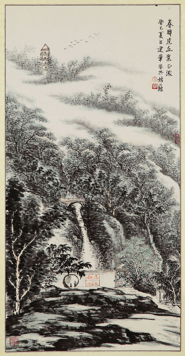 于建华长于全景式构图,这就超越了小景戏墨的范畴。没有做系统的研习传统笔墨程式的功课是无法驾驭的。为了系统地体察山水画的人文积淀的过程和笔墨程式的演进脉络,她从修为与境遇、意境与笔墨、旨趣与风格等方面,钻研了宋元明清水墨山水的传统,学画史、翻阅各种画册,临摹各宗各派作品。在广览博取的基础之上,她特别研究了黄公望、董香光、龚半千、石涛、黄宾虹诸家。揣摩他们的作品,记其笔法、构图,做到了对历代名家杰作心到手应的地步。诚然,在她的作品中不乏师法先贤的痕迹,但于建华的意境的清丽与笔墨的纯净,让人能够感觉到她对先贤的师法切和了自己作为一个女画家的灵性。她从不刻意追求山水画的雄浑壮阔,秀润、清逸是她追求的韵致。