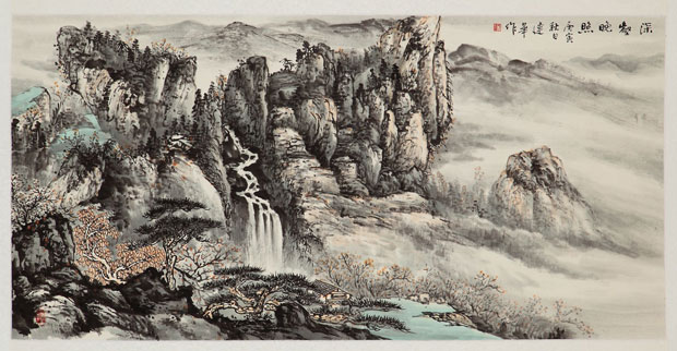 全景式的构图,较之取山水一角或层峦一势难度要大得多。女画家常常避之不及,而于建华却有大匠之风,画面经营沉着从容,视角或平远或高远,层次清晰。然而,她的山水并不以势胜而是以韵胜,不求险峻浑厚,但求秀润宁静,而将山水的恢闳辽廓蕴于她的造境的韵致之中。她始终坚守书法运笔入画,皴、擦、点、染,全以笔胜。从她的《云岫接天浮》《山色迷人秀万壑》等作品中,我们可以体察到她的山水笔墨特征,山岩、树木、荒草、泉流、涧水,皆寓钩斫于披麻,以中峰或细笔短皴来表现山石树木的明、暗、向、背,石体坚凝,草木蓊郁;并辅于雨点皴强化山峦的层次和树木的苍润。她画面更值得称道的是云岫、烟岚的灵动感,以淡墨冲破渲染与山峦相得益彰,气韵畅达,浑然天成。在用色上,从《金风吹碧水》、《红树映青山》、《深壑晚照》、《江南春色》等作品中可看出她也悟得了法门,以光源透视敷色,常以极淡的石青或赭石渲染,润而不滞,丽而不俗。笔墨剔除了“犷、纤、结”彰显了“逸、润、骨力”空灵蕴藉而有韵度。